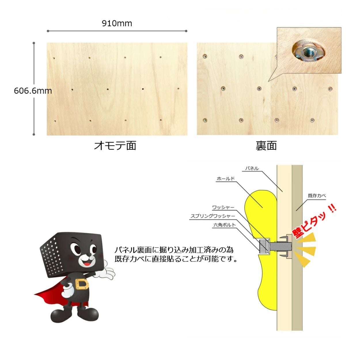 ※パネルに内蔵されている金物は錆びにくいコーティングがされておりますが金物素材は鉄の為、外部の雨ざらしになるような場所への取り付けはお控えください。
