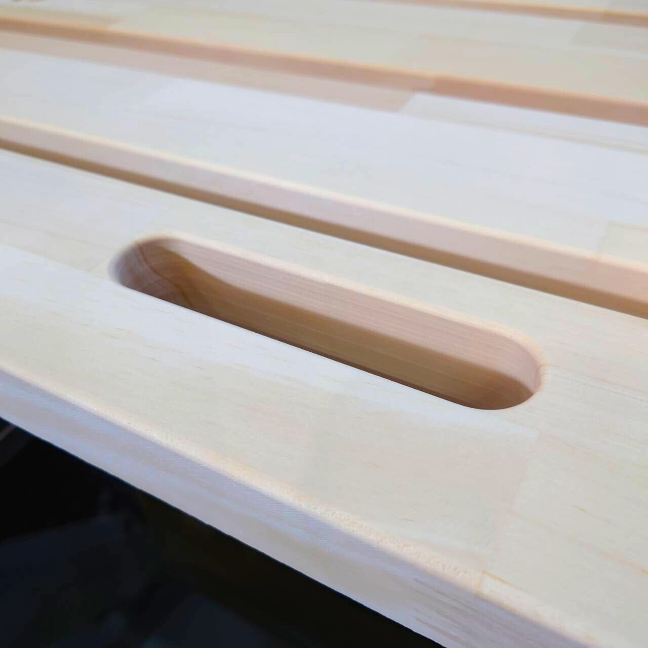 柱は全て集成材の一枚板から切り出しています。捻りや反りが小さく、組立後のガタツキを最小限にしております。2×4材のようにヤニ(樹液)がでることもありません。